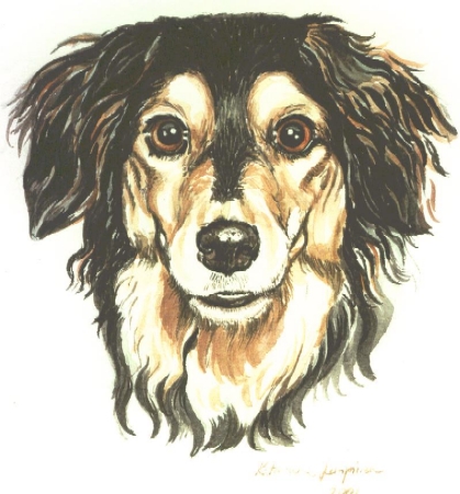 watercolour This lively cross-breed was taken out of the cluttered background in the photograph, to emphasise the keen look of a dog ready to play.